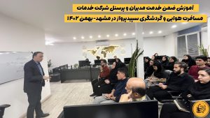 این دوره آموزشی ضمن خدمت با درخواست مدیران شرکت خدمات مسافرتی و گردشگری سپید پرواز برای حدود 40 نفر از پرسنل این شرکت در مشهد برگزار شد.